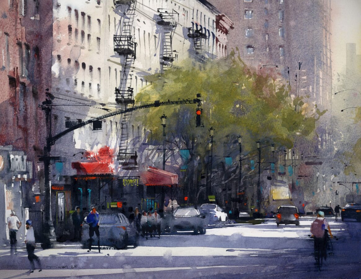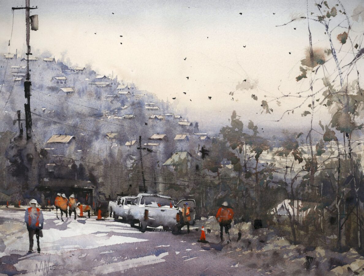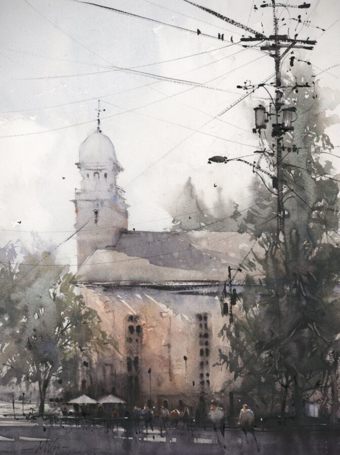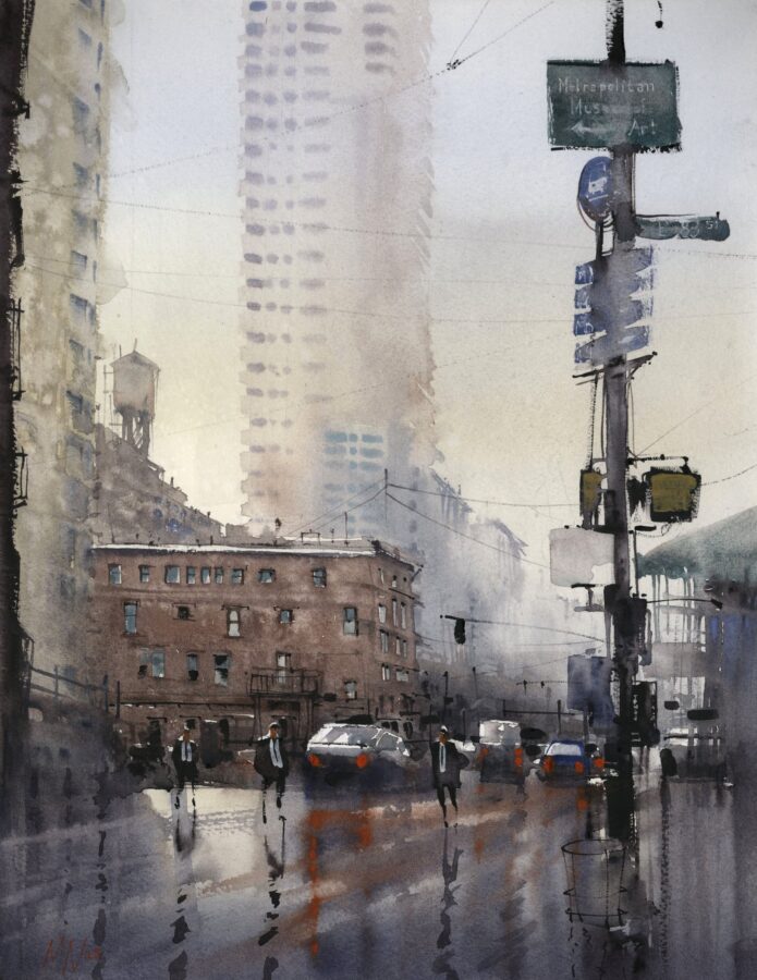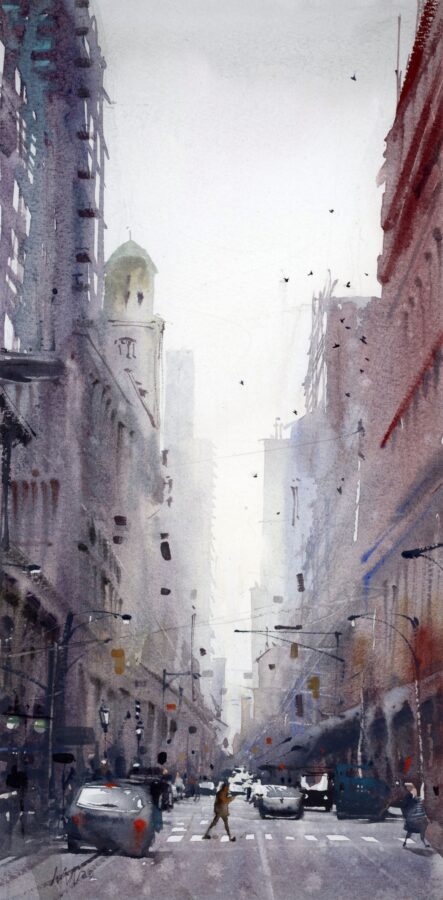 The nature of watercolor is to be free; it dries fast. Once you put down a mark you cannot paint over it like you can with acrylic or oil. Each touch of the brush is a deliberate mark colored by the artist’s perception and attitude of the subject. Watercolor requires you to be confident with yourself and correspondingly with your strokes. You have to enjoy the way the pigment settles; if you do try to rework anything, it only looks encumbered. Watercolor is honest.
